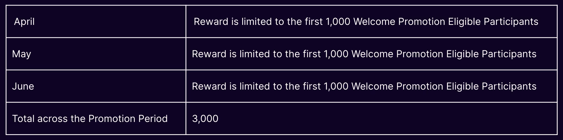 - Each Welcome Reward Successful Participant is entitled to only one (1) Reward.