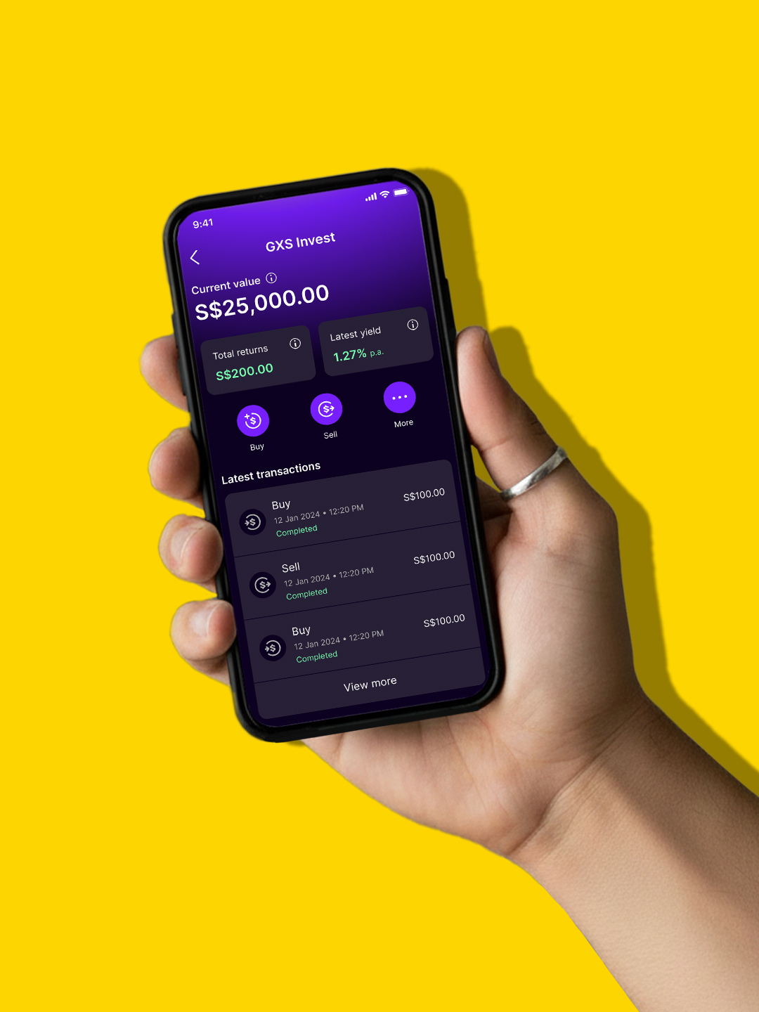 Monitor your investments and view your latest holdings, such as the market value, returns and yield, easily on the GXS Bank app.