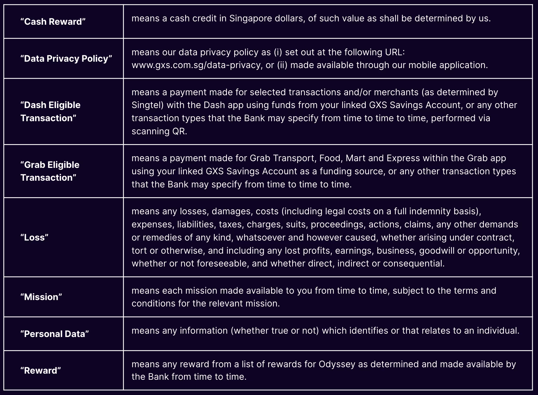 These Odyssey Terms (“Terms”) set out the terms and conditions that govern the relationship between GXS Bank Pte. Ltd. (the “Bank”, “us”, “we” or “our”) and the customer (“you” or “your”) and the Bank’s loyalty programme, Odyssey, that we provide to you under these Terms.