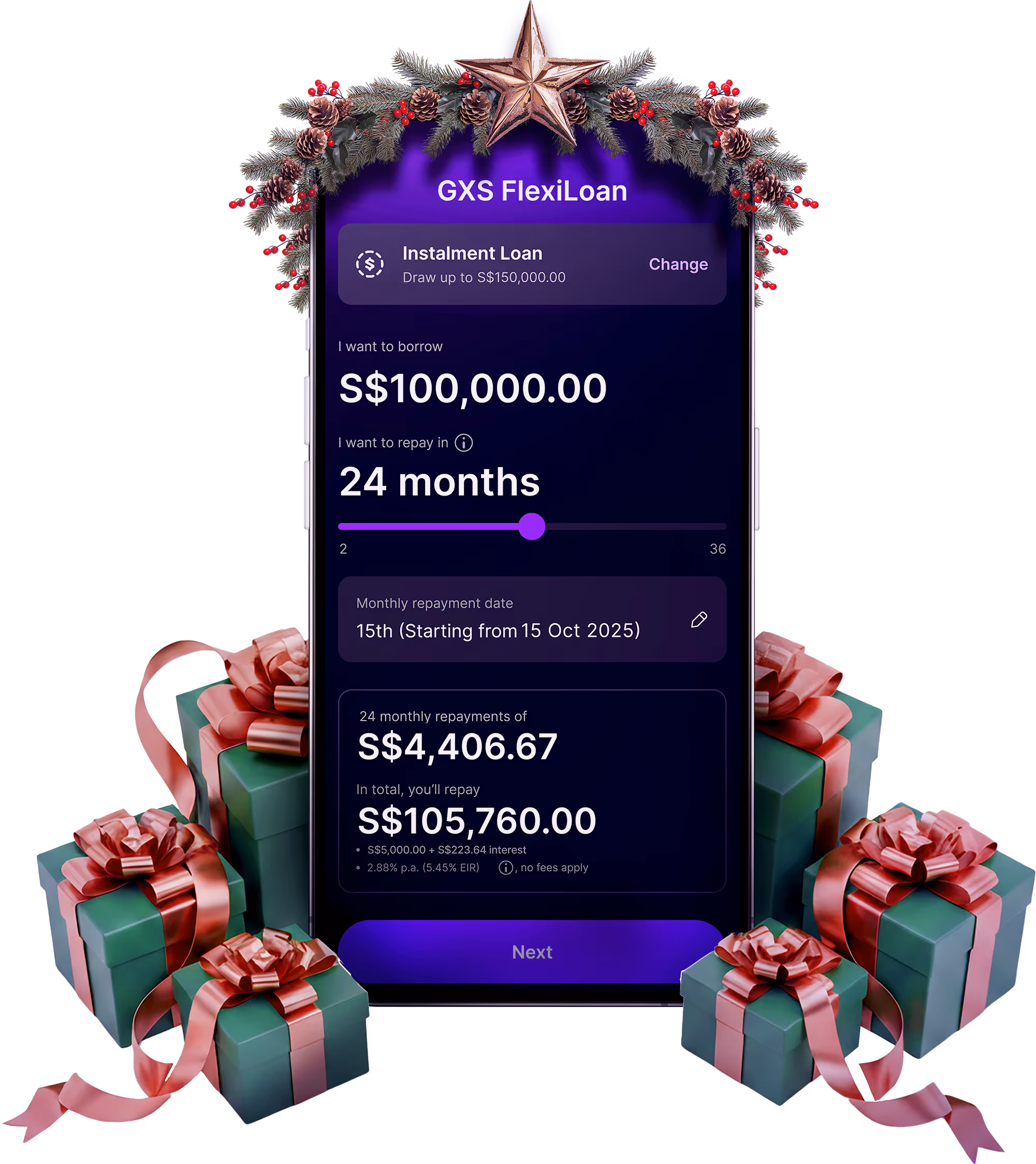 The minimum monthly repayment is the higher of S$15 or your personalised minimum monthly repayment percentage starting from 1% of your loan. Find yours on your GXS Bank app.