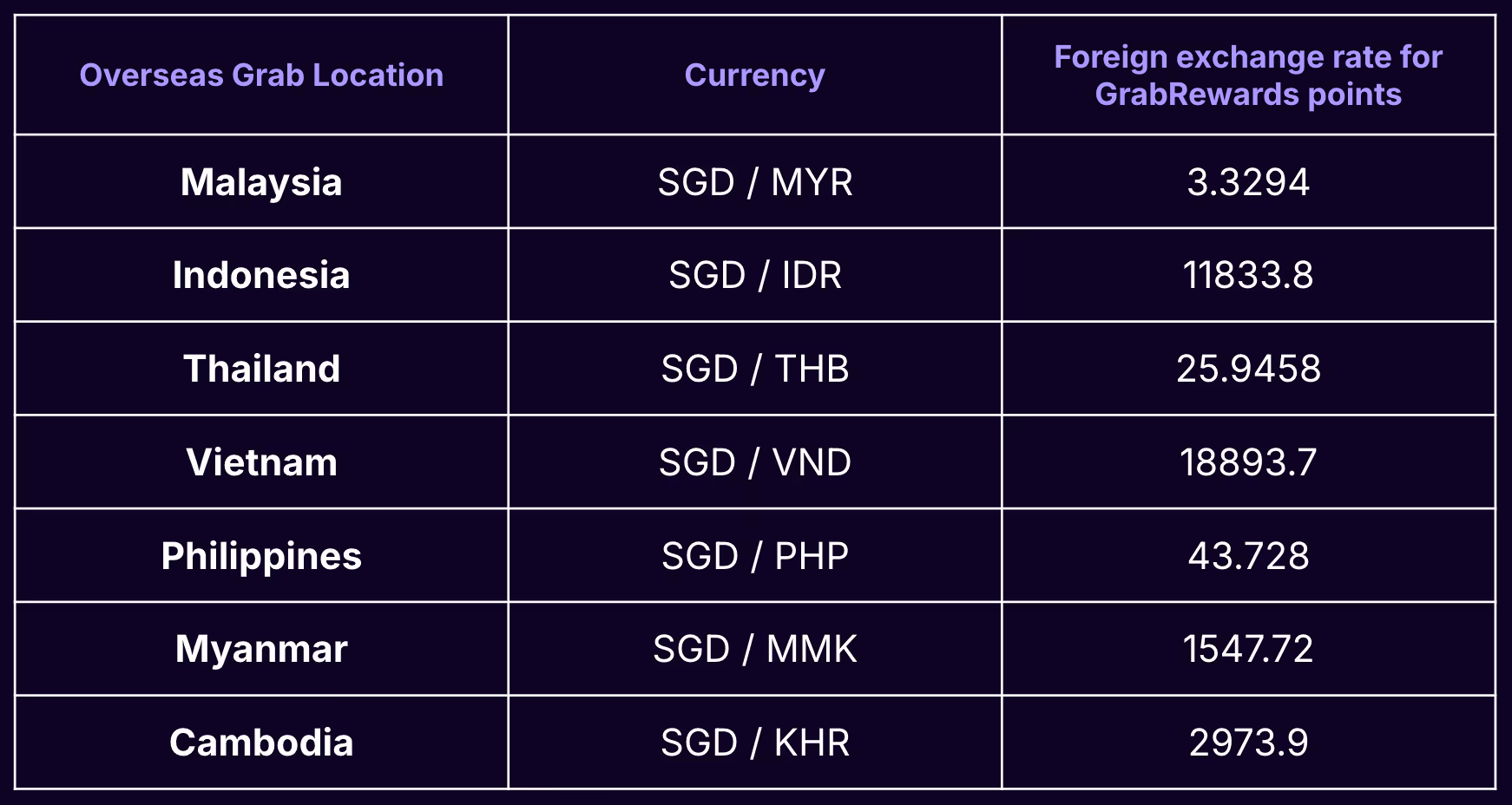 GrabRewards points issued are based on the destination currency charges on Grab and converted into Singapore Dollars based on the following exchange rates. The following exchange rates are fixed and will be used throughout this campaign period to award GrabRewards points.